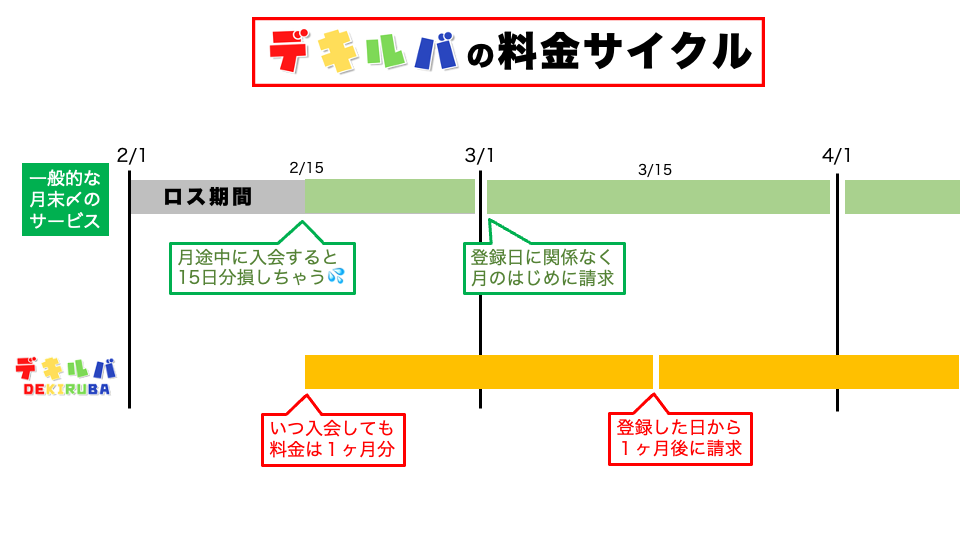 月途中でも損しません。入会時のお支払いの後、2回目のお支払いのタイミングはいつ入会したとしても1ヶ月後になります。