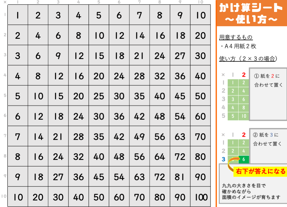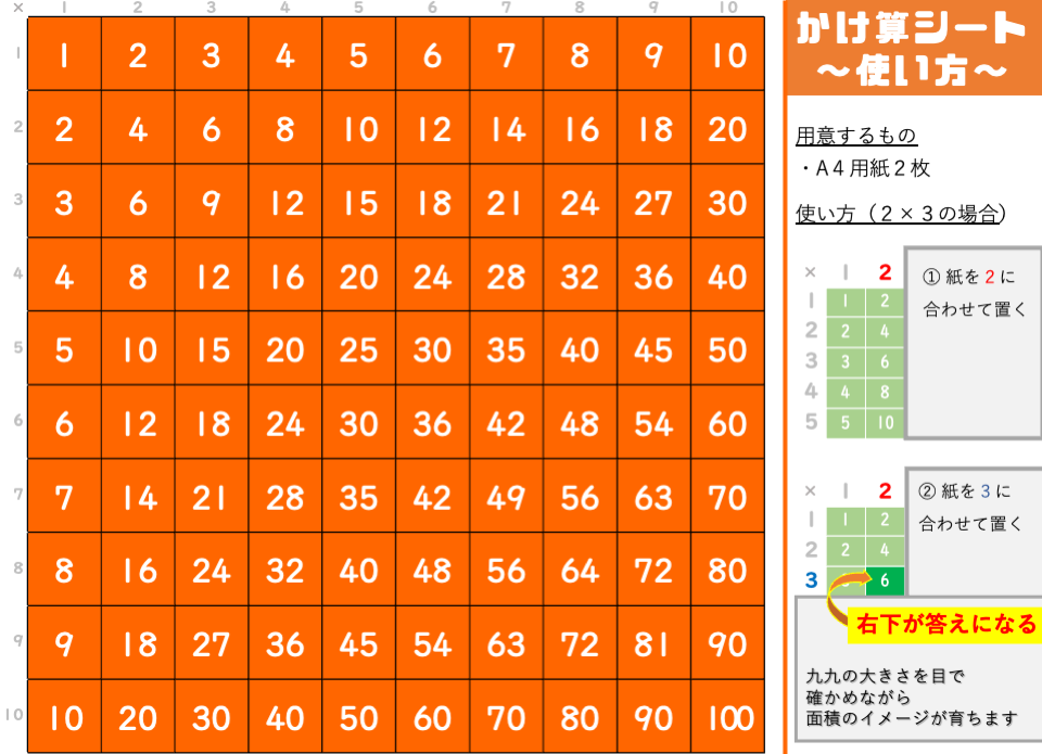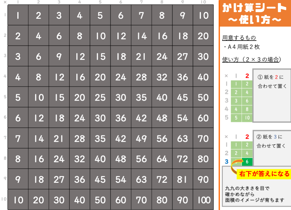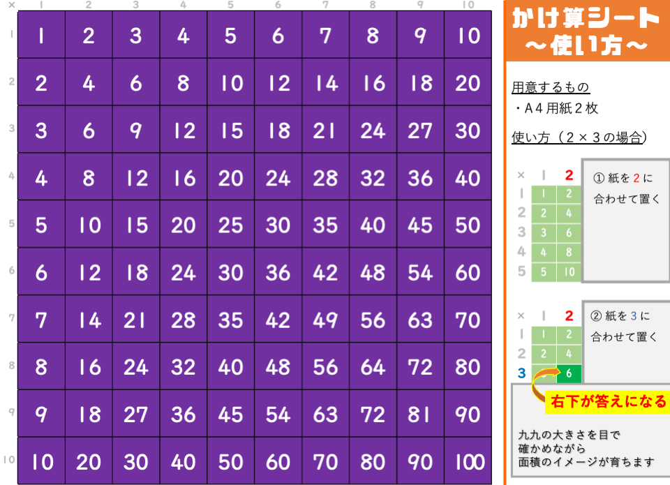 かけ算の答えを確かめるとき、どうせなら四角形の面積の学習につながるような特別な九九シートで答えを確かめてみましょう!