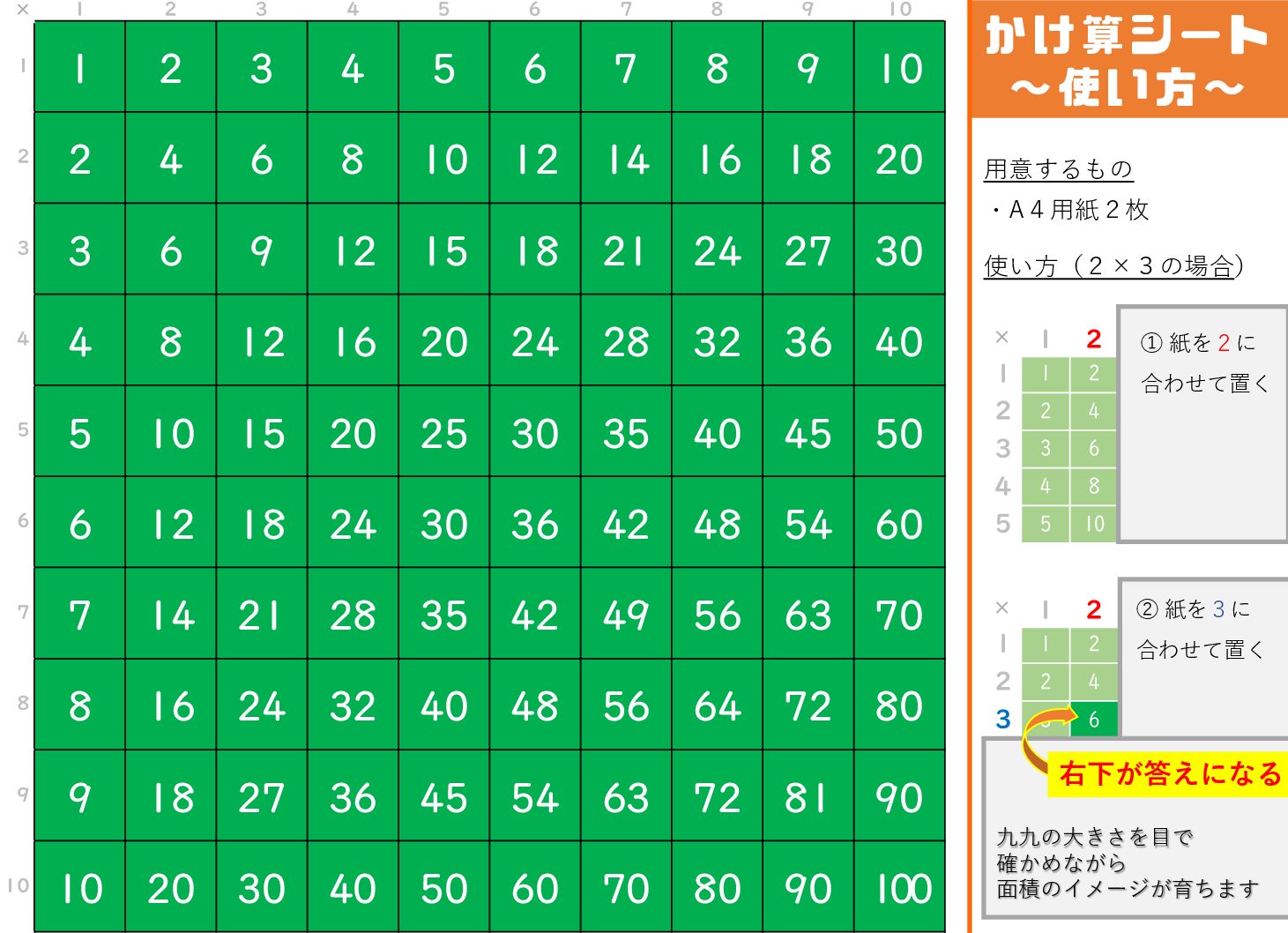 かけ算の答えを確かめるとき、どうせなら四角形の面積の学習につながるような特別な九九シートで答えを確かめてみましょう!
